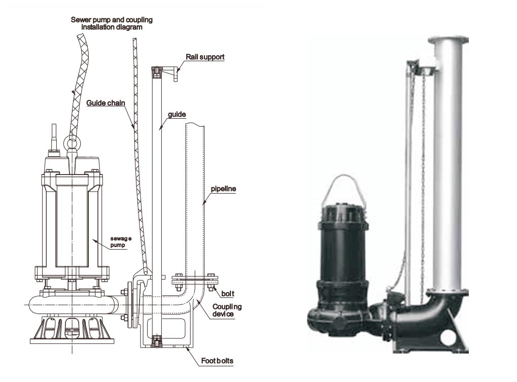 • Le système de montage par guide réduit et soulève simplement la pompe pour connecter facilement la pompe au pipeline, sans entrer dans le puisard pour un entretien et une inspection faciles.