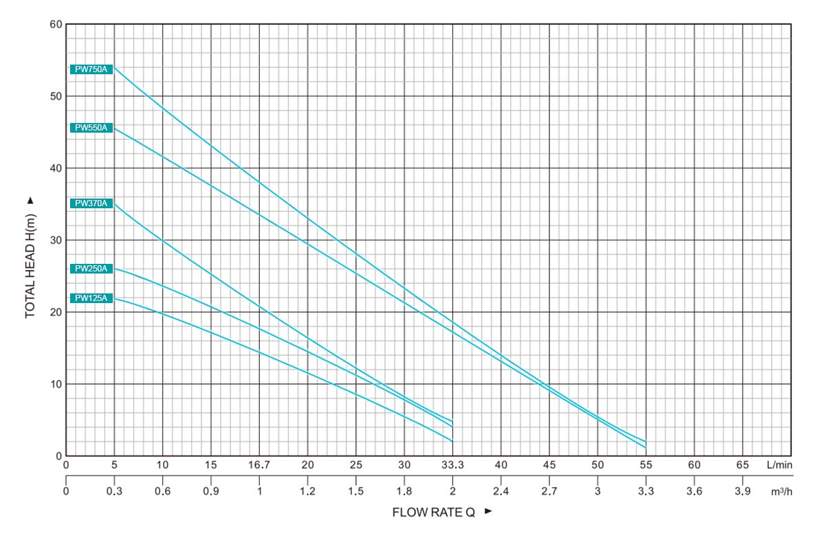 | PW125A | 0.125 | 0.17 | 1" | 1" | H(m) | 24 | 22 | 20 | 20 | 16 | 12 | 9 | 5 | 2 | - | - | - | - | ||