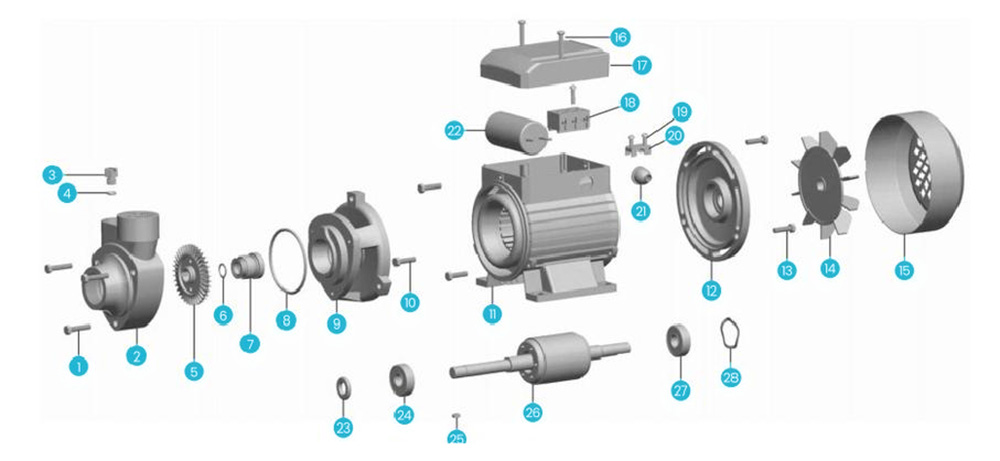 | 1 | Boulon | 11 | Boîtier avec stator bobiné | 21 | Fairleigh |