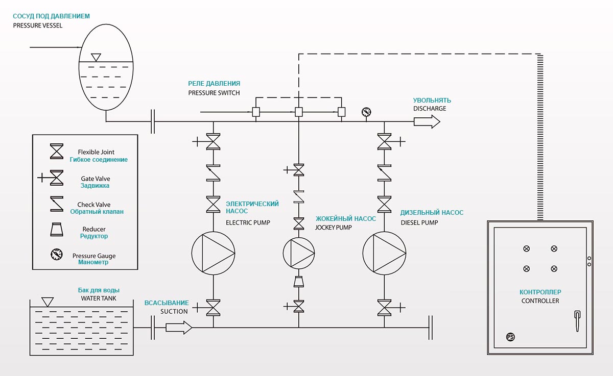 Lorsque la pression chute en dessous de la valeur définie, le jockey commence à fonctionner avec le signal du pressostat et continue de fonctionner pendant 10 minutes jusqu'à ce que la pression du système atteigne la valeur définie. Si la pression continue de baisser, la pompe principale commence d'abord à fonctionner. Si la pression du système ne peut pas fournir et que la pression continue de baisser, la pompe de secours commence à fonctionner.
