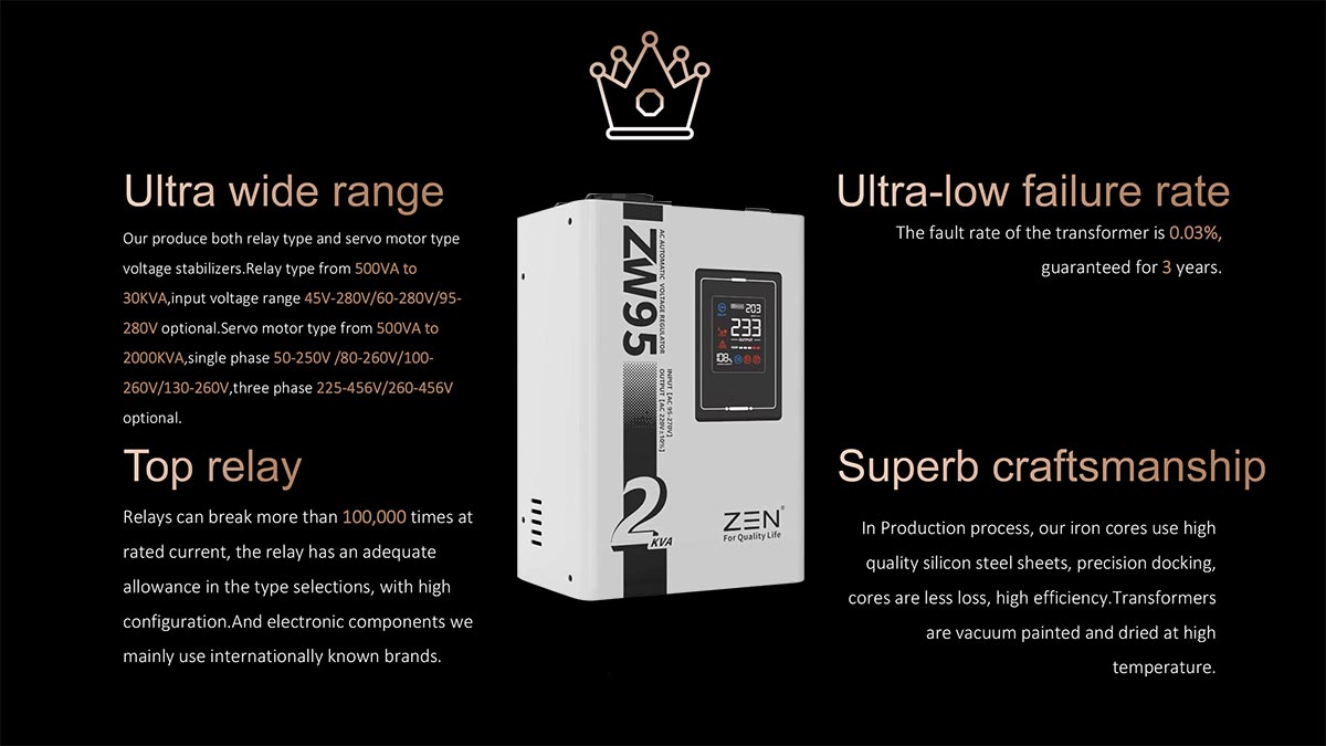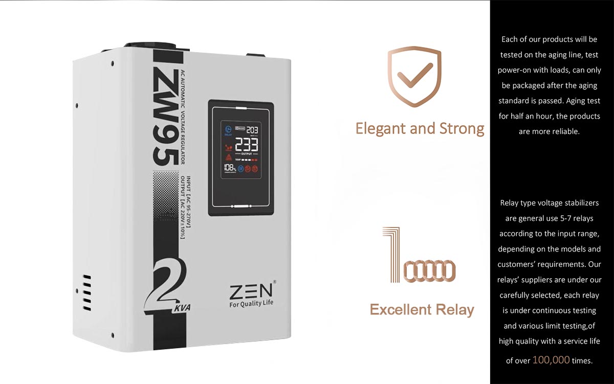 Les marques de régulateurs de tension CA automatiques ZW95 1KVA à 30KVA de haute qualité de ZEN Machinery Factory sont connues pour leur haute qualité et leur fiabilité, ce qui en fait un choix populaire pour les applications résidentielles et industrielles. Caractéristiques du produitCe modèle est un petit régulateur de tension 220 V entièrement automatique conçu pour l'affichage numérique LED portable. Il présente les caractéristiques d'une petite taille, d'un poids léger, d'un réglage rapide de la tension, d'aucune distorsion de la forme d'onde, etc.