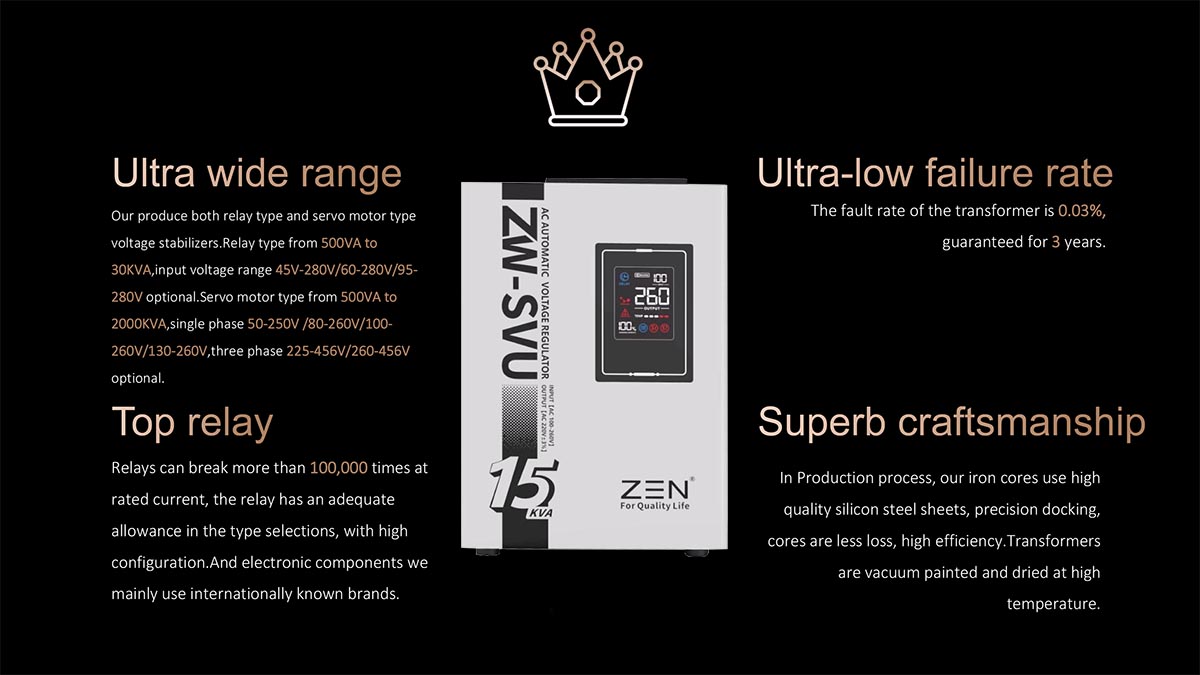 Le régulateur de tension CA automatique ZWSVU 15KVA de haute qualité de l'usine ZEN Machinery est un fabricant et fournisseur célèbre en Chine, spécialisé dans la production de régulateur de tension CA automatique ZWSVU 15KVA de haute qualité. Caractéristiques du produitCe modèle est un petit régulateur de tension 220 V entièrement automatique conçu pour l'affichage numérique LED portable. Il présente les caractéristiques d'une petite taille, d'un poids léger, d'un réglage rapide de la tension, d'aucune distorsion de la forme d'onde, etc.